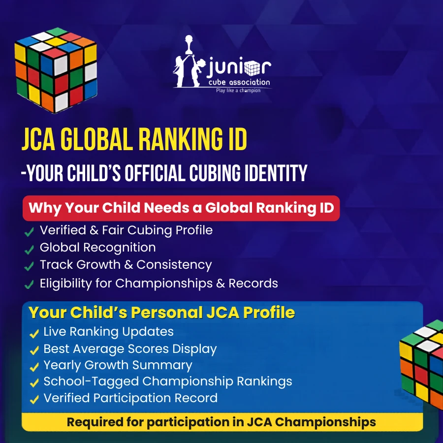 The JCA Global Ranking ID creates your child’s official cubing profile on the Junior Cube Association platform.